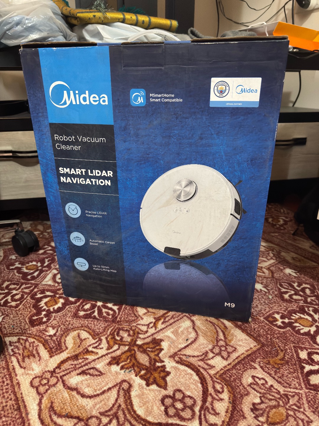 Midea M9 — умный робот-пылесос для сухой и влажной уборки с мощностью всасывания до 4000 Па. Оснащён лазерной навигацией LiDAR, строит карту помещения, управляется через приложение по Wi-Fi и работает до 180 минут без подзарядки. Подходит для разных покрытий, автоматически возвращается на базу и имеет HEPA-фильтр для эффективной очистки воздуха.