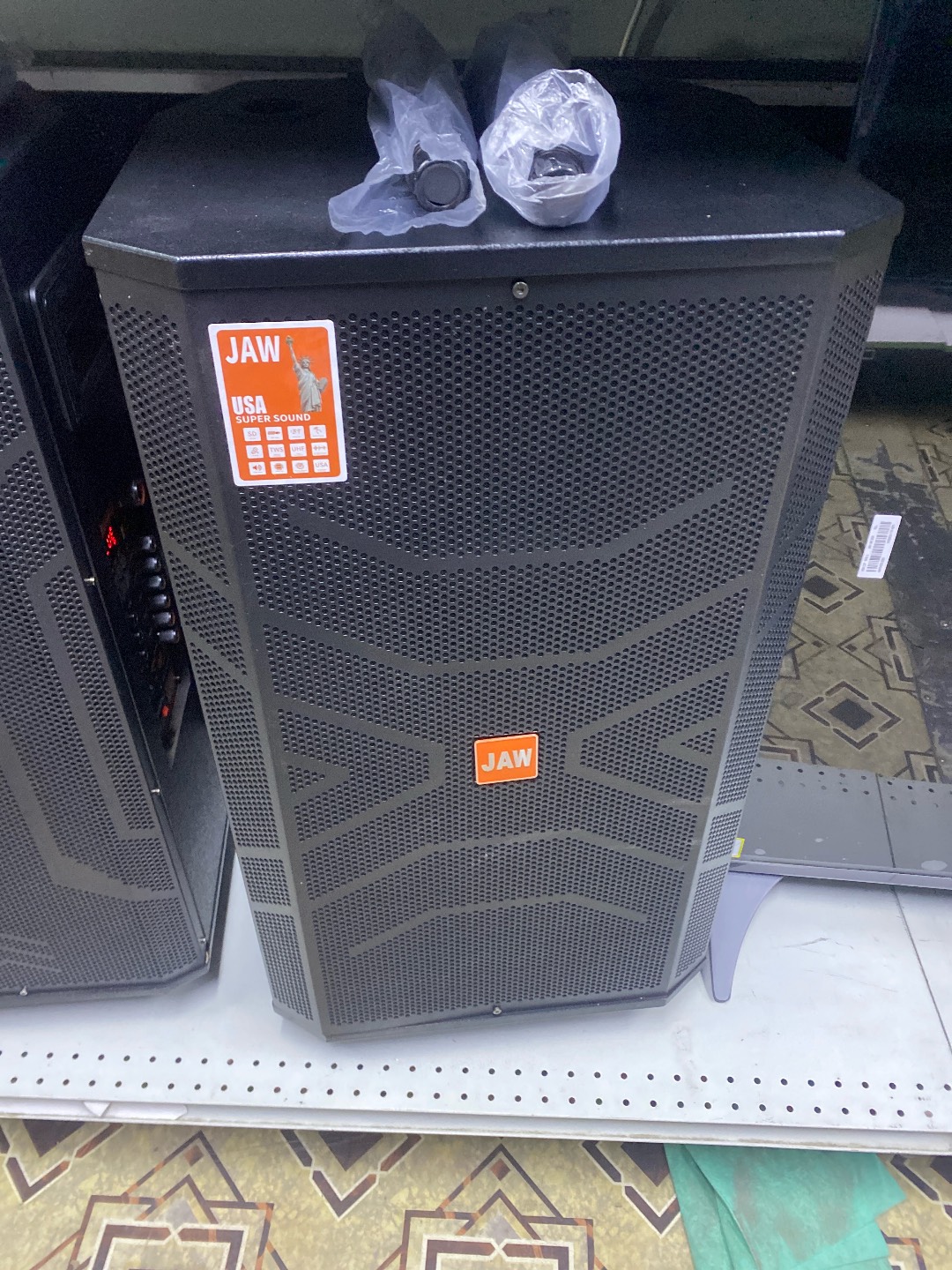 На фотографии представлены акустические системы бренда JAW. Это типичные представители категории «портативных систем для вечеринок» (party speakers) или бюджетных профессиональных колонок, которые часто используются для мероприятий, караоке и уличных выступлений.